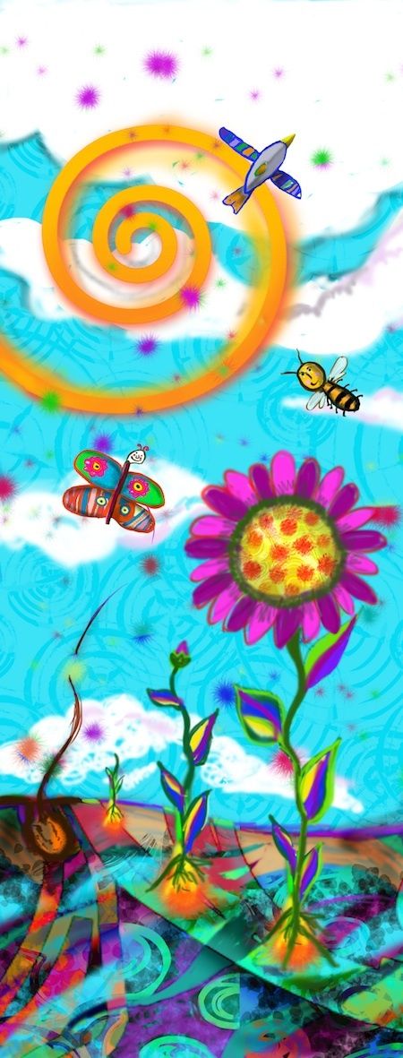 Au commencement, je reçois les dessins des enfants...C'est à partir de la "synthèse" de tous ces dessins, et en gardant au maximum la fraîcheur de ceux-ci que je vais construire les images préparatoires des colonnes...